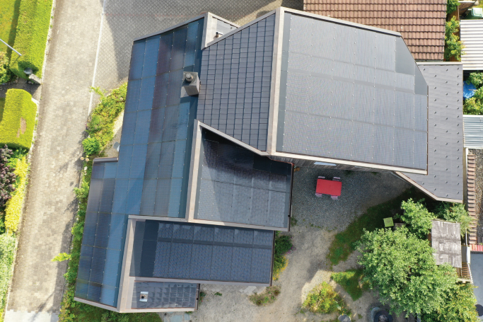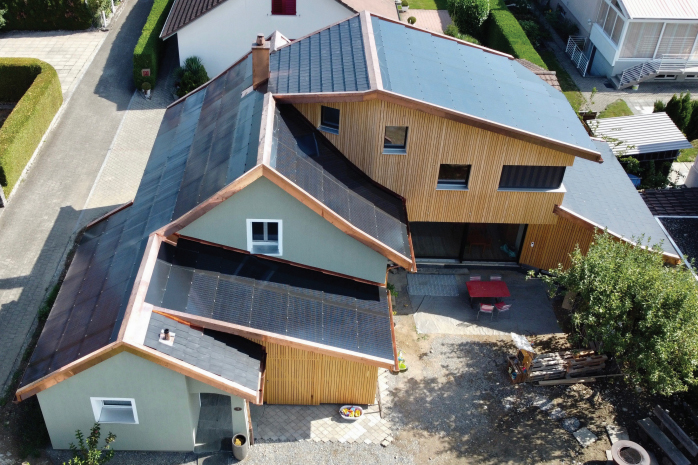 Bei der Umsetzung stand die Nachhaltigkeit im Zentrum. So kamen unter anderem Schafwolldämmung und Lehmputzträgerplatten zum Einsatz. Auf dem Dach wurde zudem eine Photovoltaikanlage instaliert, die sich über die gesamte Fläche erstreckt – eine ästhetische und energieeffiziente Lösung.