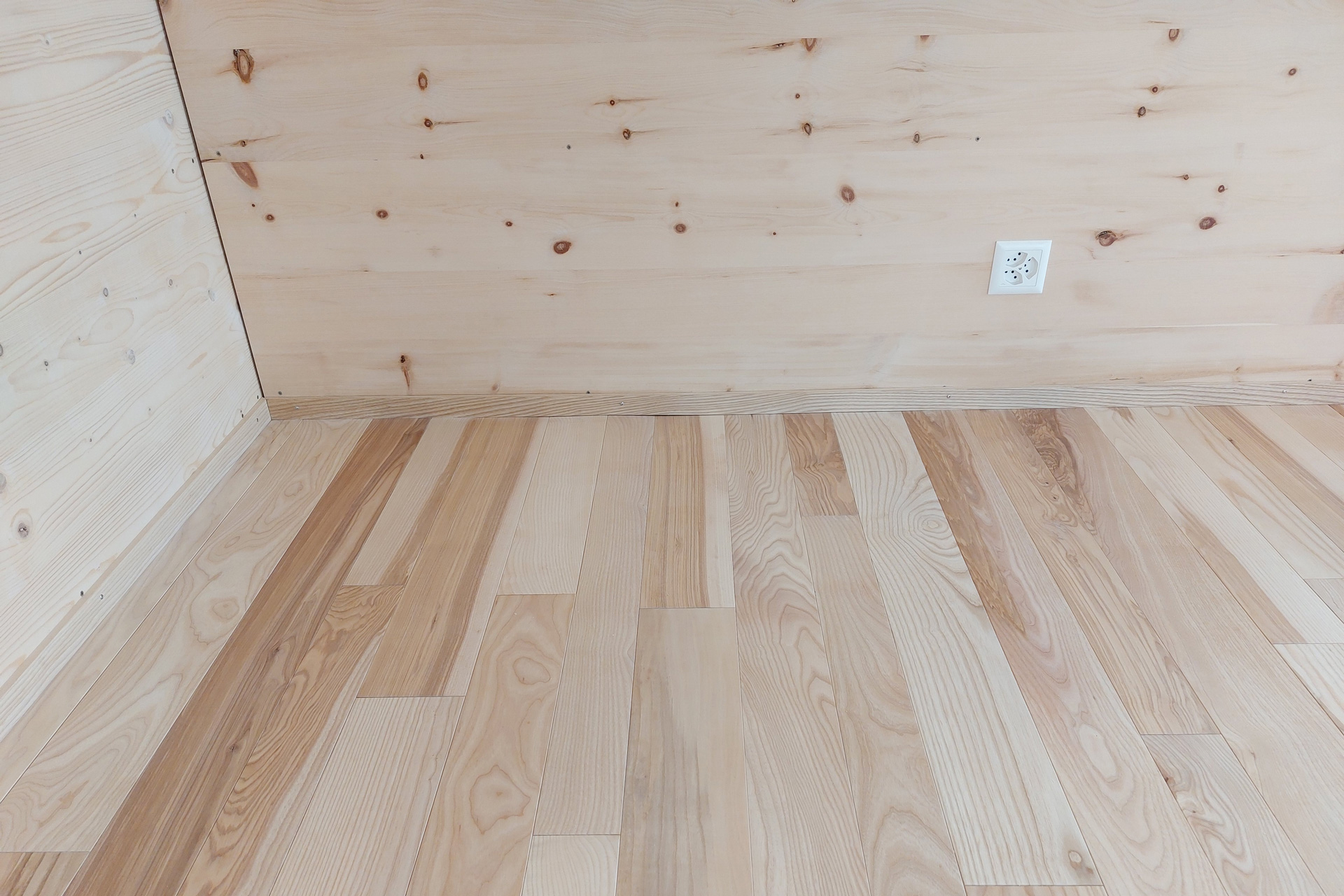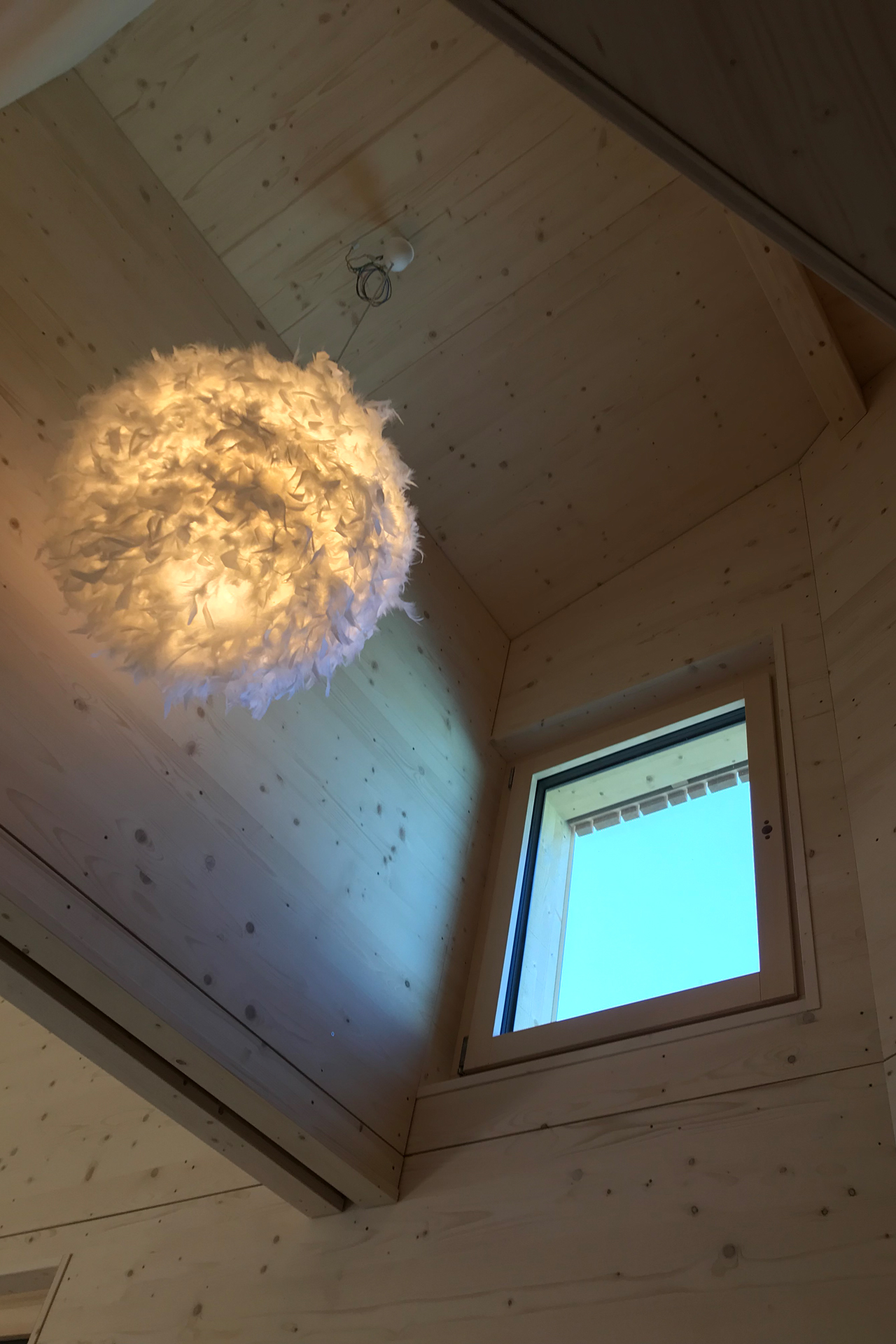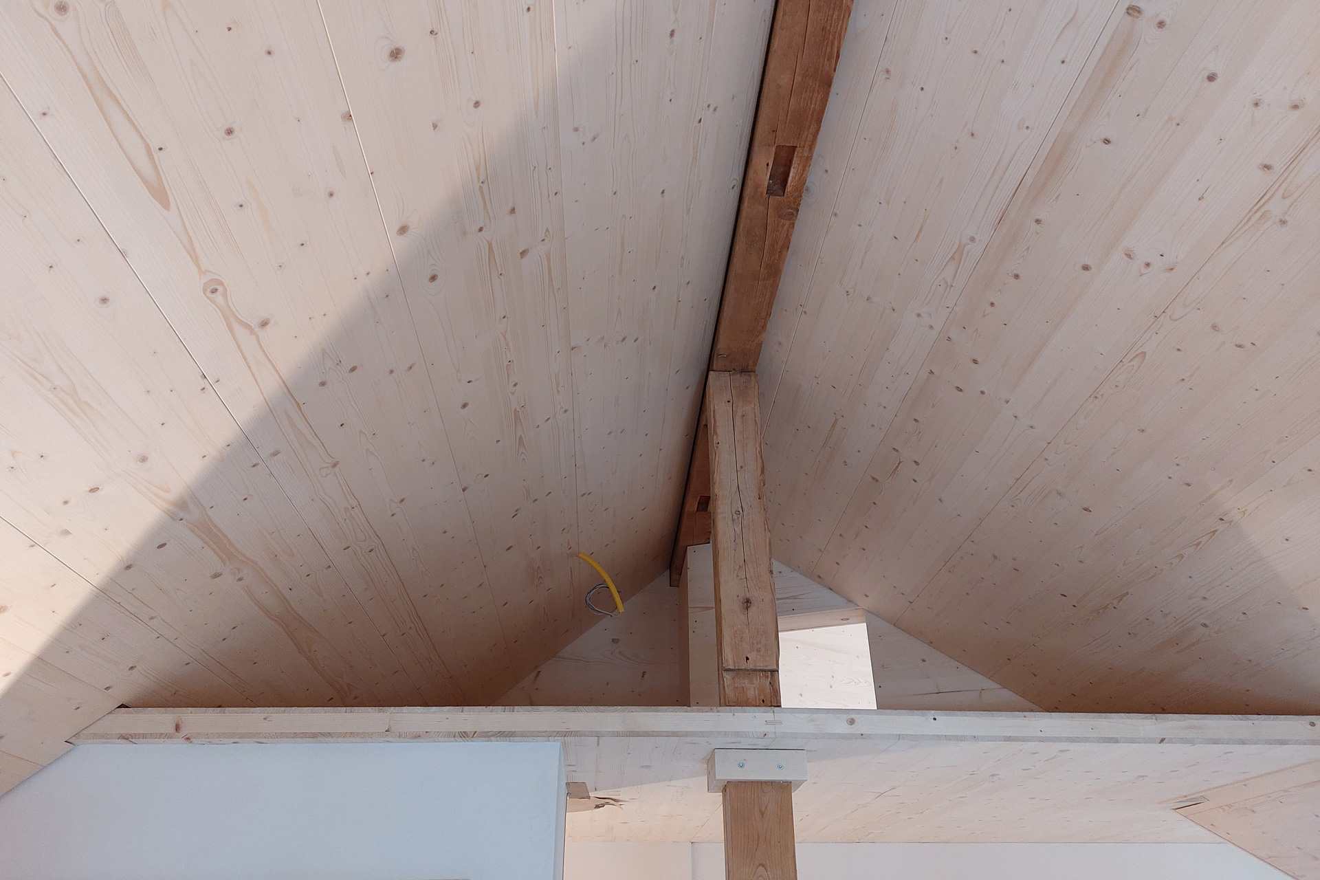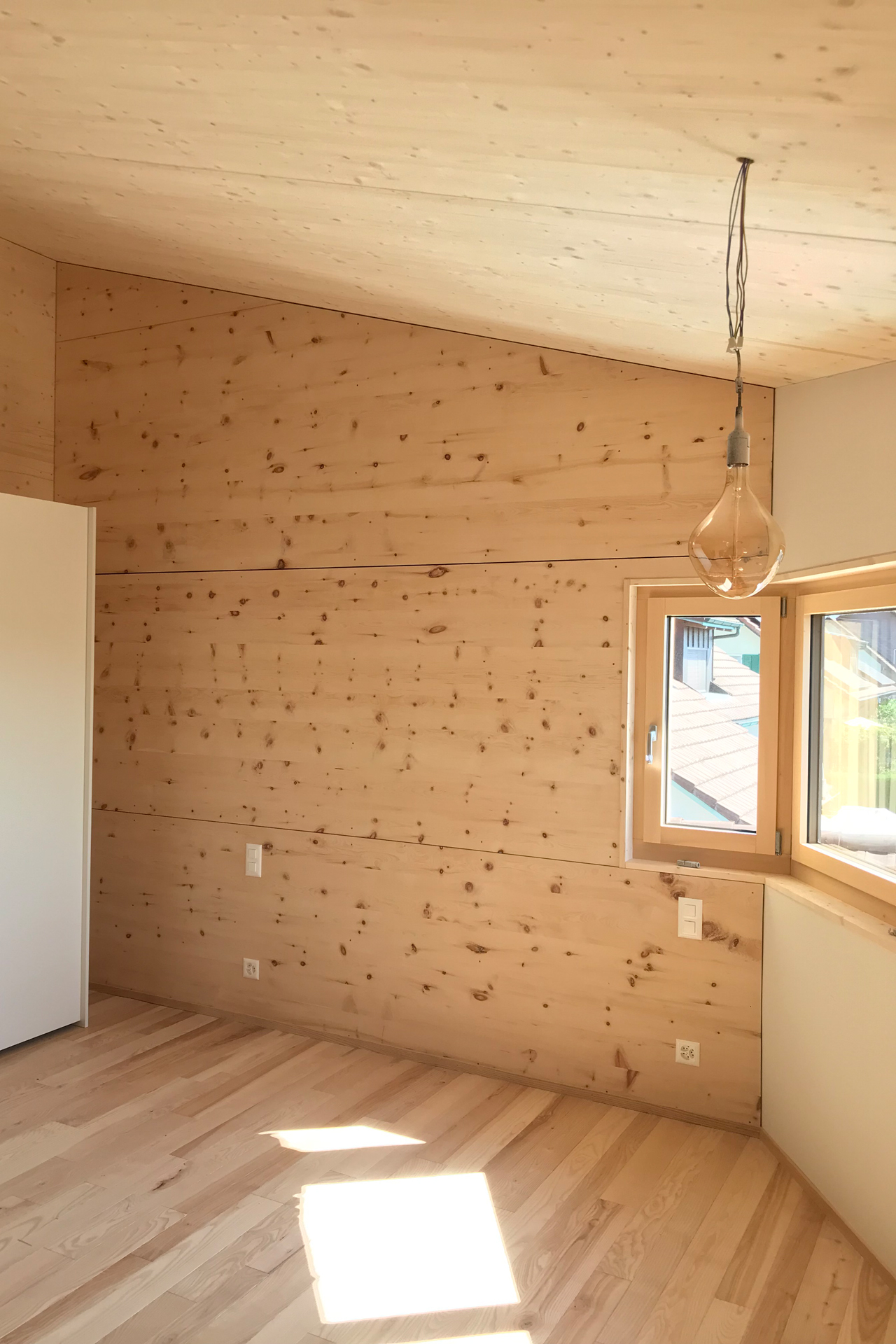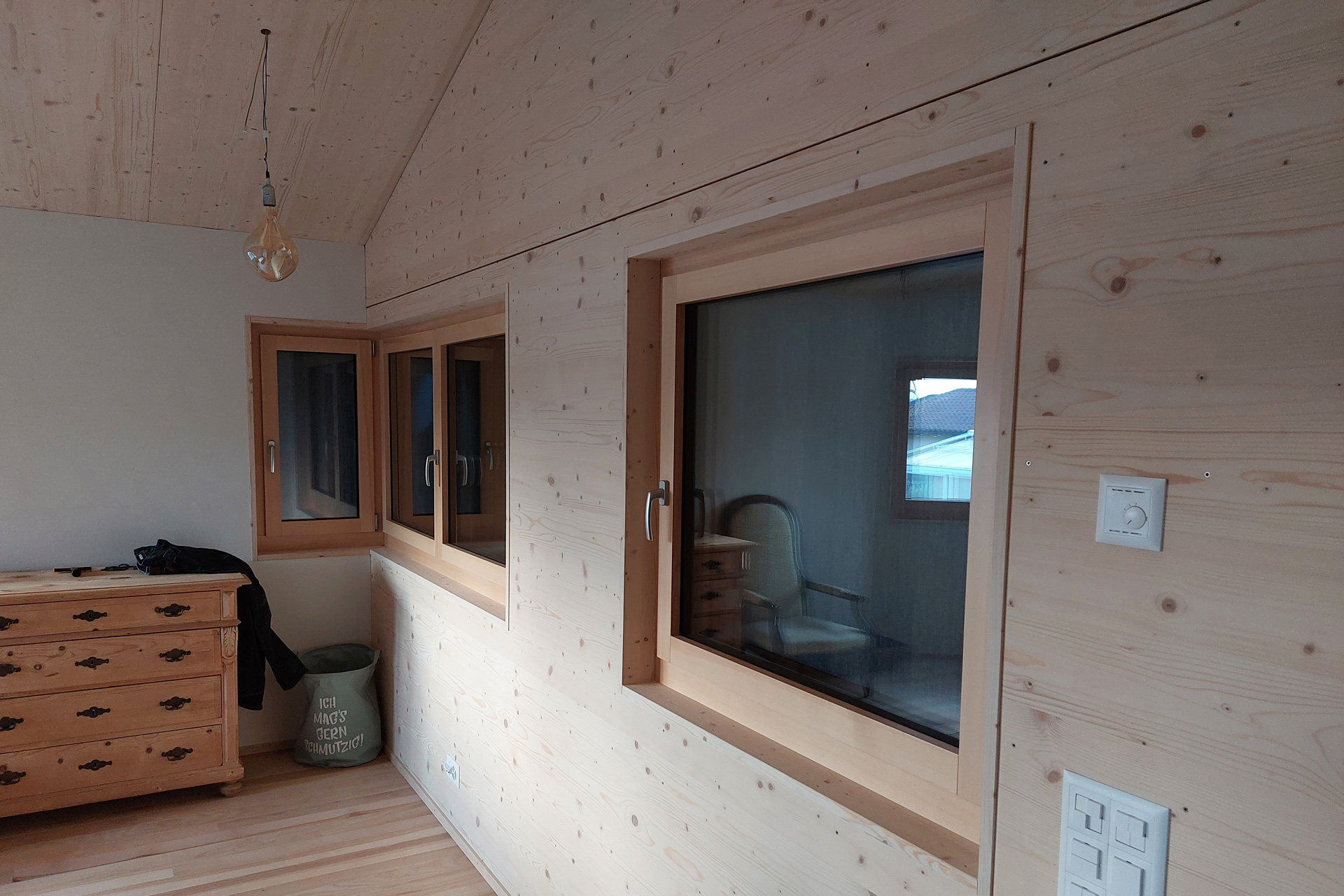 Ein zentrales, gestalterisches und technisches Element ist die sichtbare Dachkonstruktion, die mit einem UV-Stop behandelt wurde, um langfristige Beständigkeit zu gewährleisten. Im Innenausbau wurde viel Wert auf natürliche Materialien gelegt. Die Bodenriemen aus massiver Esche mit Braunkern wurden mit Bianco-Öl veredelt. Im Schlafzimmer sorgt eine Dreischichtplatte aus Arve für ein angenehmes Raumklima.