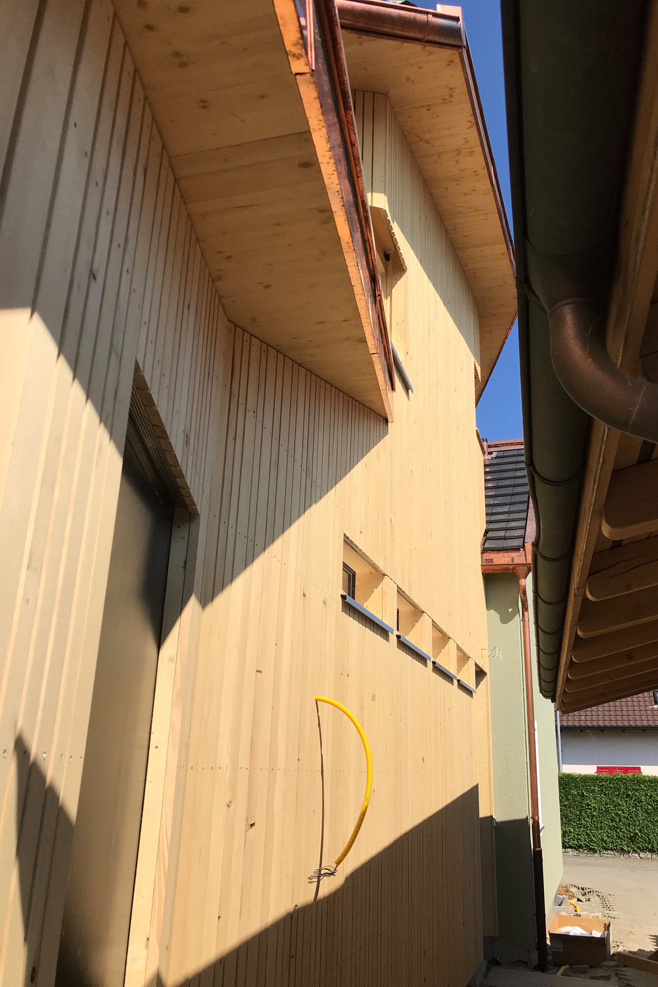 Das bestehende Einfamilienhaus wurde umfassend kernsaniert und durch Anbauten in moderner Systembauweise erweitert. Besonders ins Auge fällt die vertikal geschalte Holzfassade mit variierenden Brettbreiten, die unbehandelt ist, um eine natürliche Alterung und maximale Authentizität zu erreichen.
