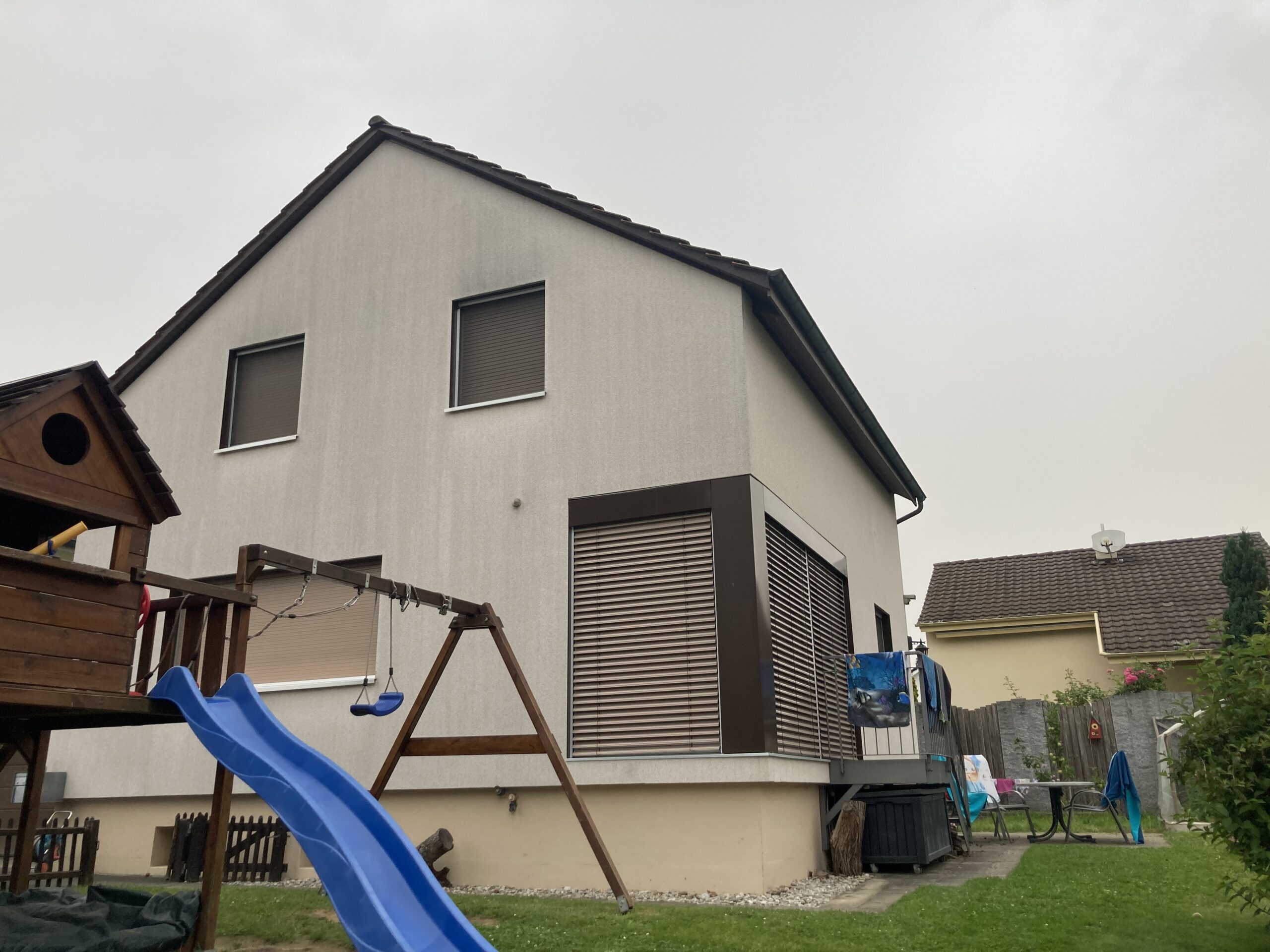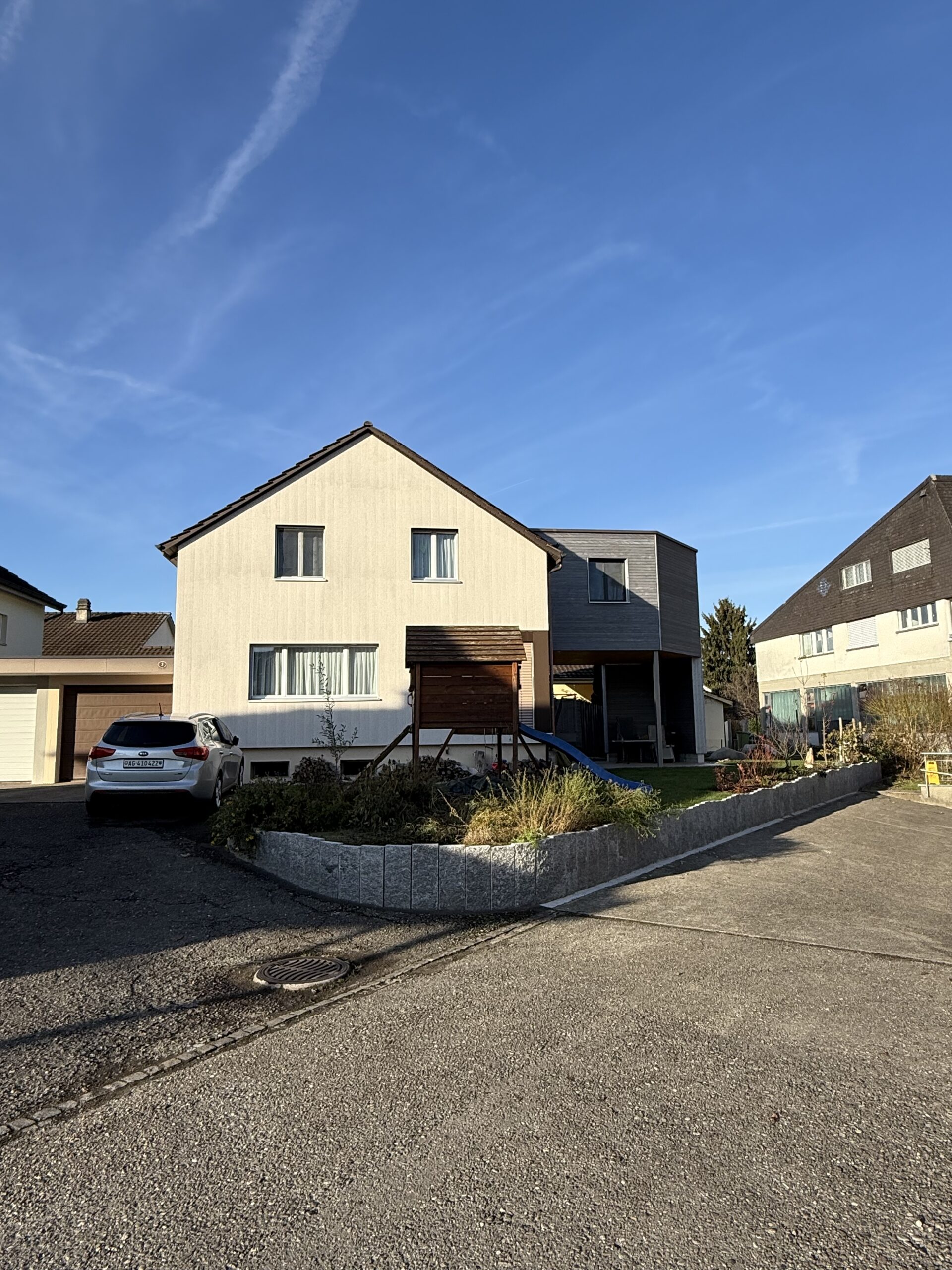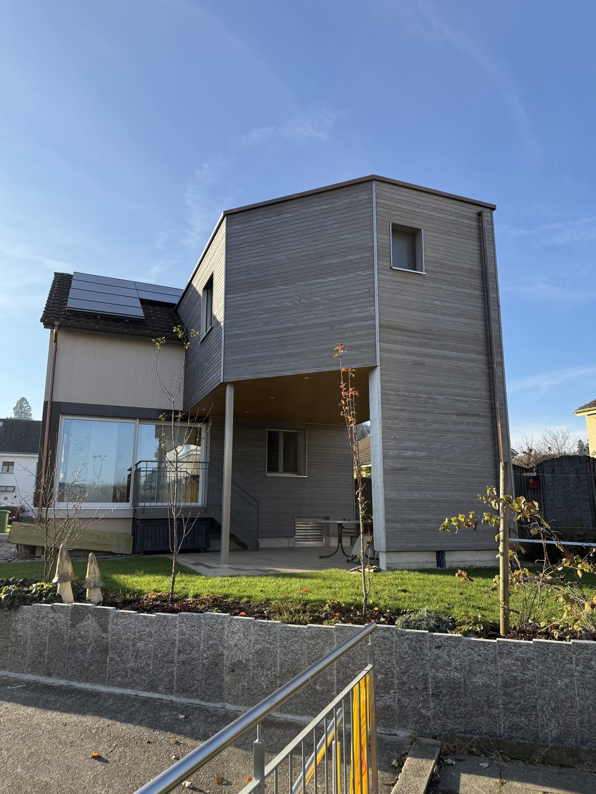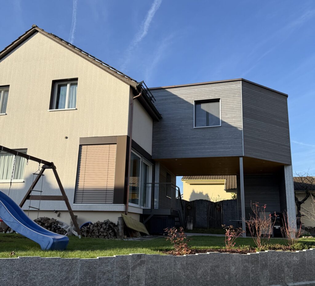 Beim Projekt in Dintikon wurde ein Anbau an ein bestehendes Einfamilienhaus realisiert und zusätzlicher Wohnraum geschaffen. Die Konstruktion wurde in Systembauweise aufgerichtet und umfasst auch eine überdachte Sitzplatzlösung.