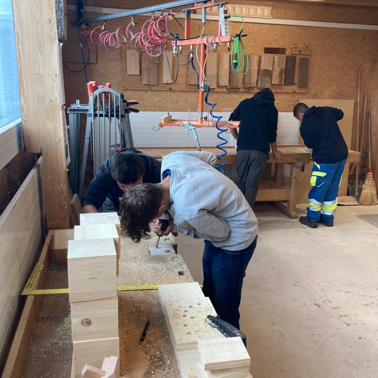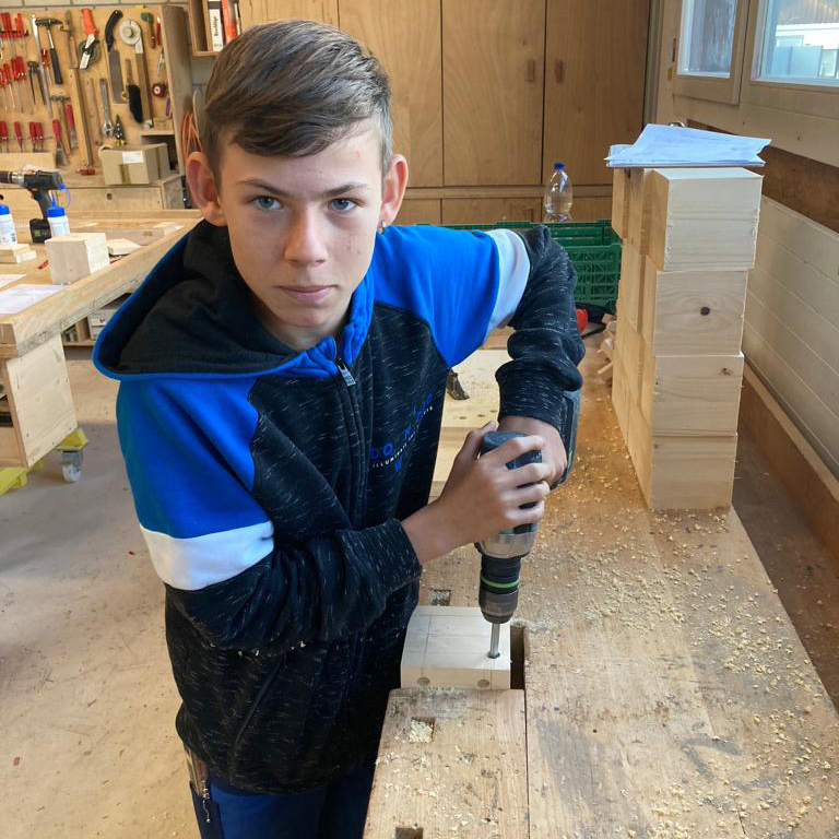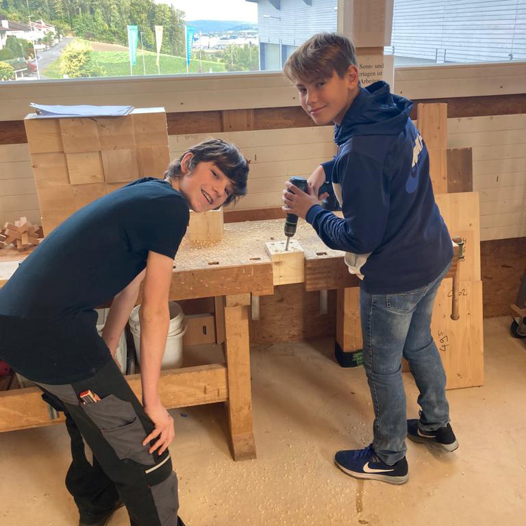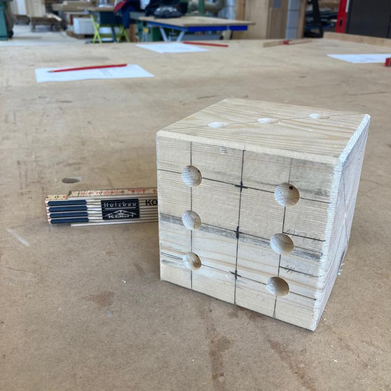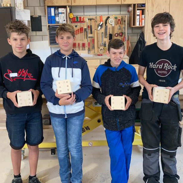 In unserer Zimmerei durften die interessierten Jugendlichen einen überdimensionalen Holzwürfel herstellen. Es wurde angerissen, gezeichnet und gebohrt. So entstanden innert kurzer Zeit sehr schöne Spielwürfel.