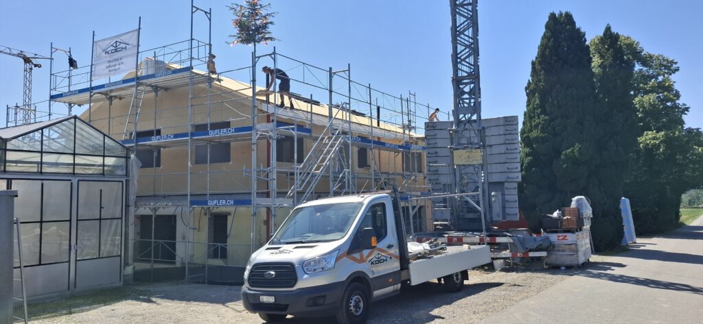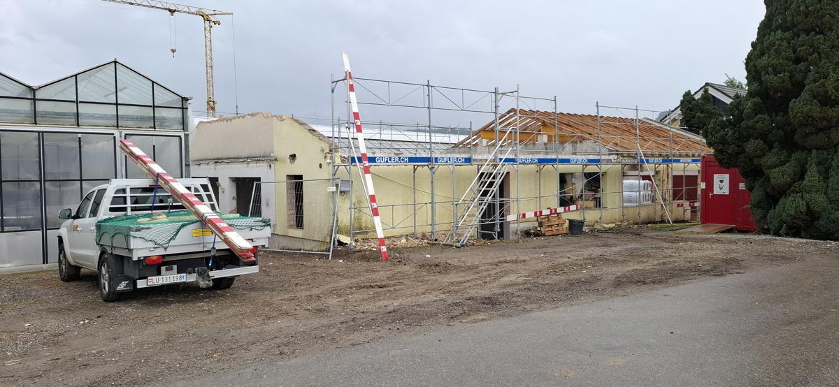 Der vordere Teil des Gebäudes wurde bis auf den Betondeckel zurückgebaut, danach wurden die Wände und das Satteldach in Systembau aufgerichtet. Der hintere Teil wurde komplett saniert. Das bestehende Dach wurde bis auf die Sparrenlage zurückgebaut, kontrolliert und teilweise verstärkt oder ersetzt. Danach wurde der Dachaufbau neu erstellt. Zusätzlich wurde eine sichtbare Balkenlage eingebaut, um eine weitere Etage zu schaffen.