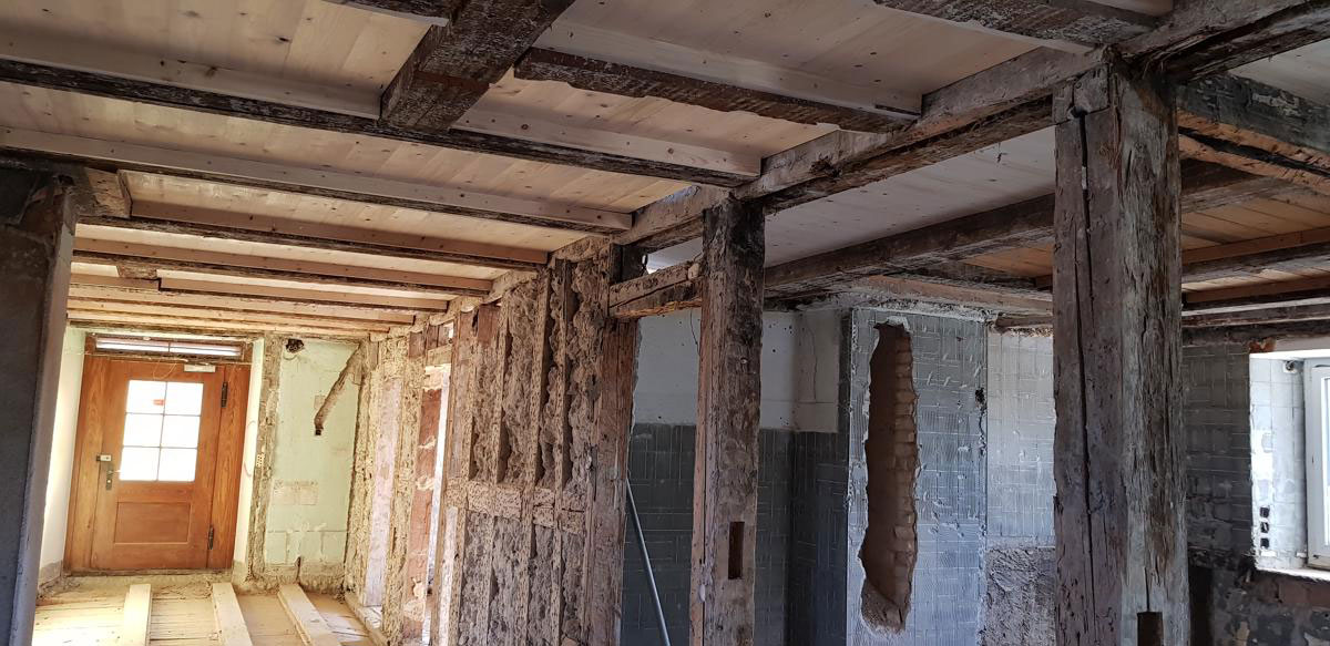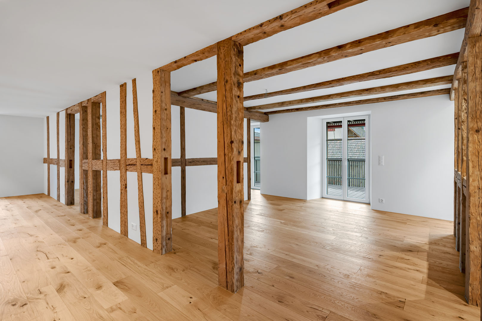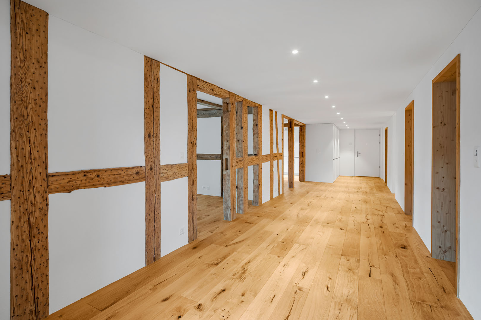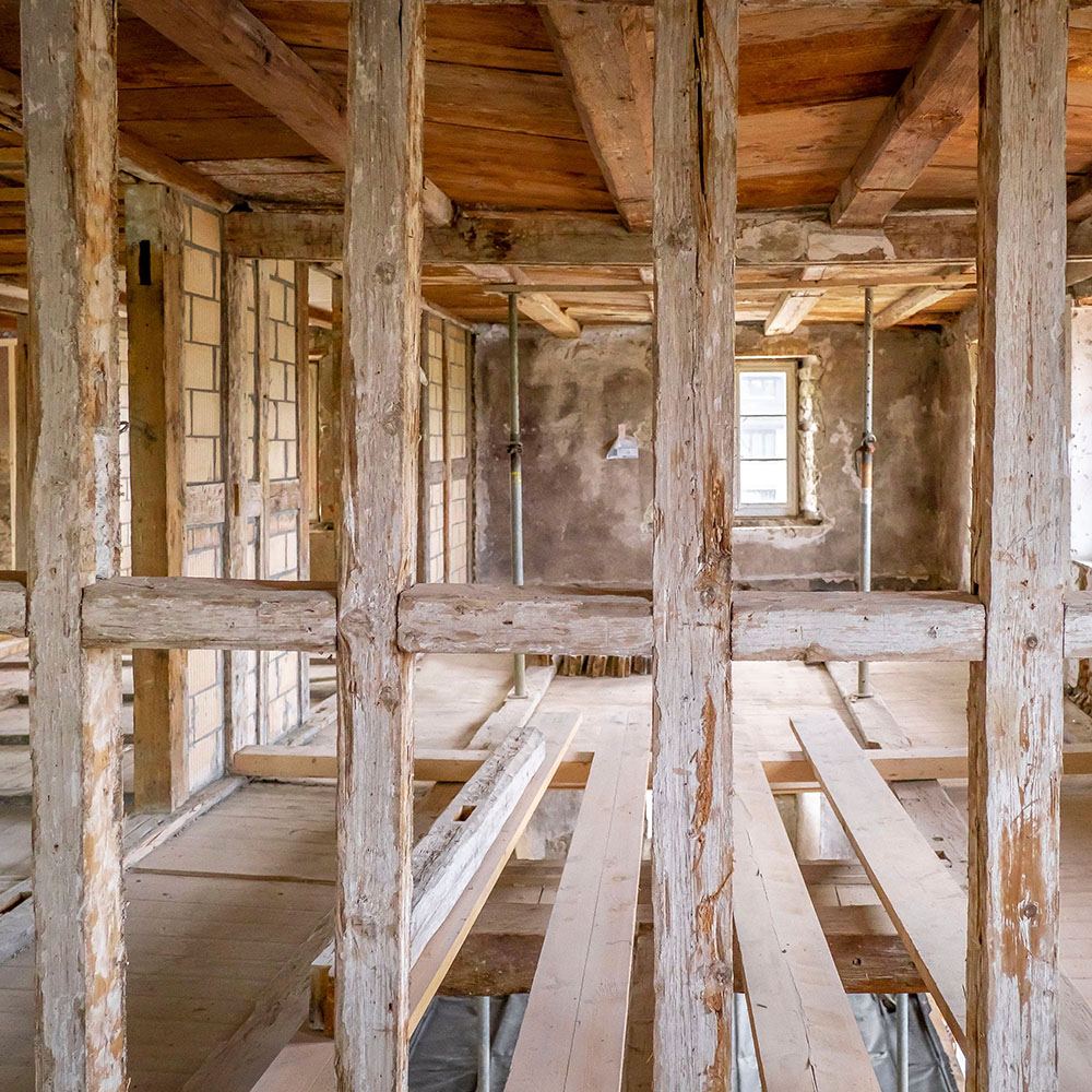 und eingesetzt wurden. So blieben gewisse Balken, Streben und Pfosten bestehen und wurden als