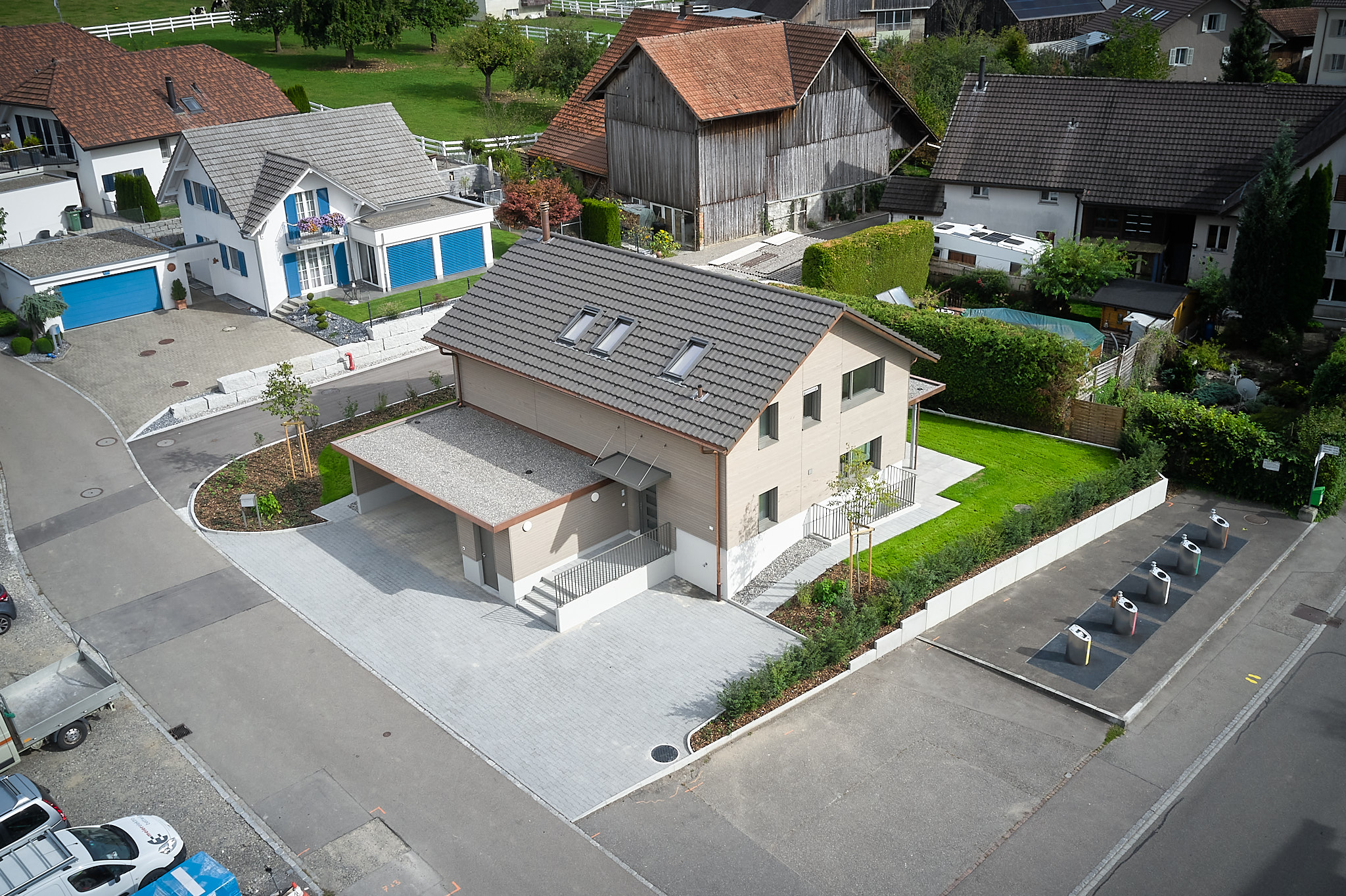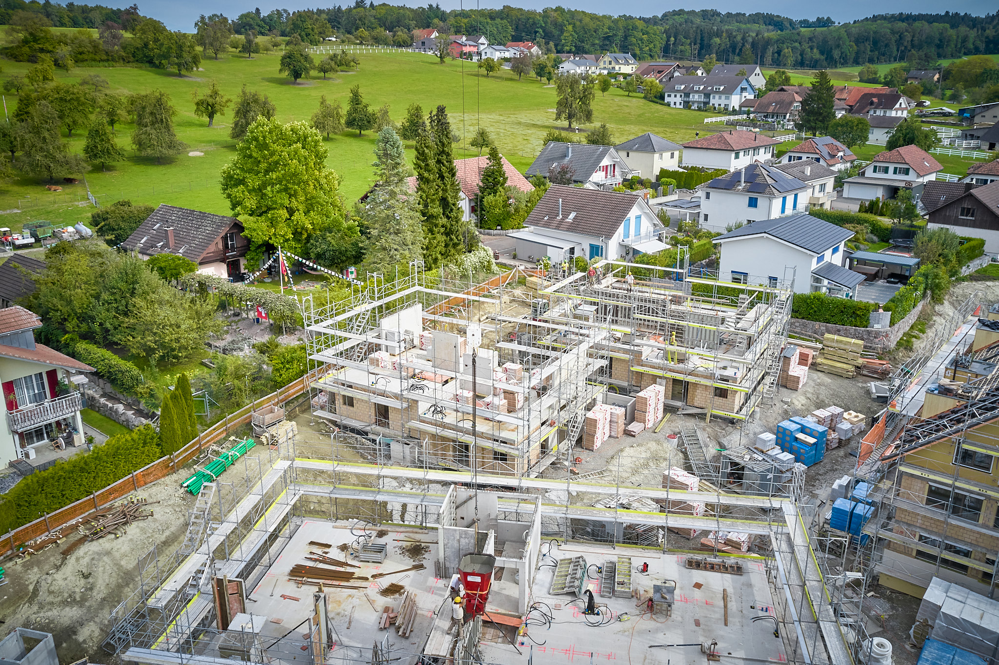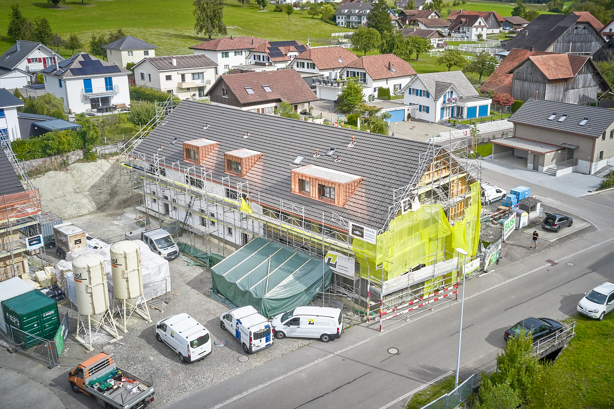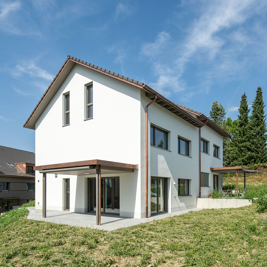 Die dreigeschossigen Mehrfamilienhäuser sowie die Doppel- und Reiheneinfamilienhäuser wurden mit hochwertigen Materialien und nach den neusten Minergie-Standards gebaut. Die Konstruktion der Dachgeschosse ist aus Holz, vorfabriziert in den eigenen Hallen von uns.