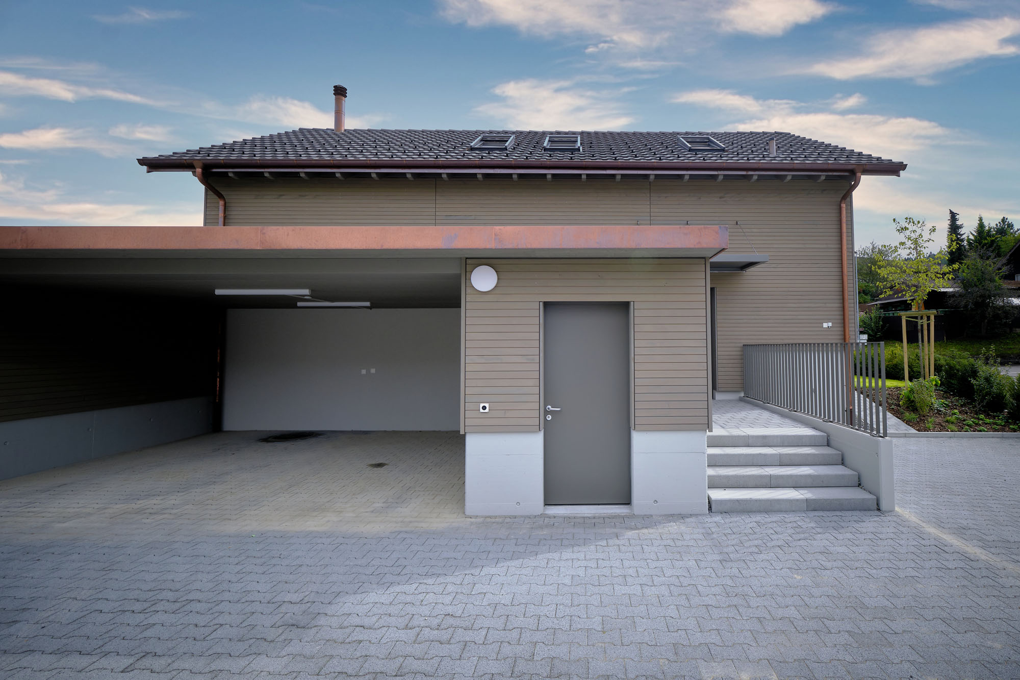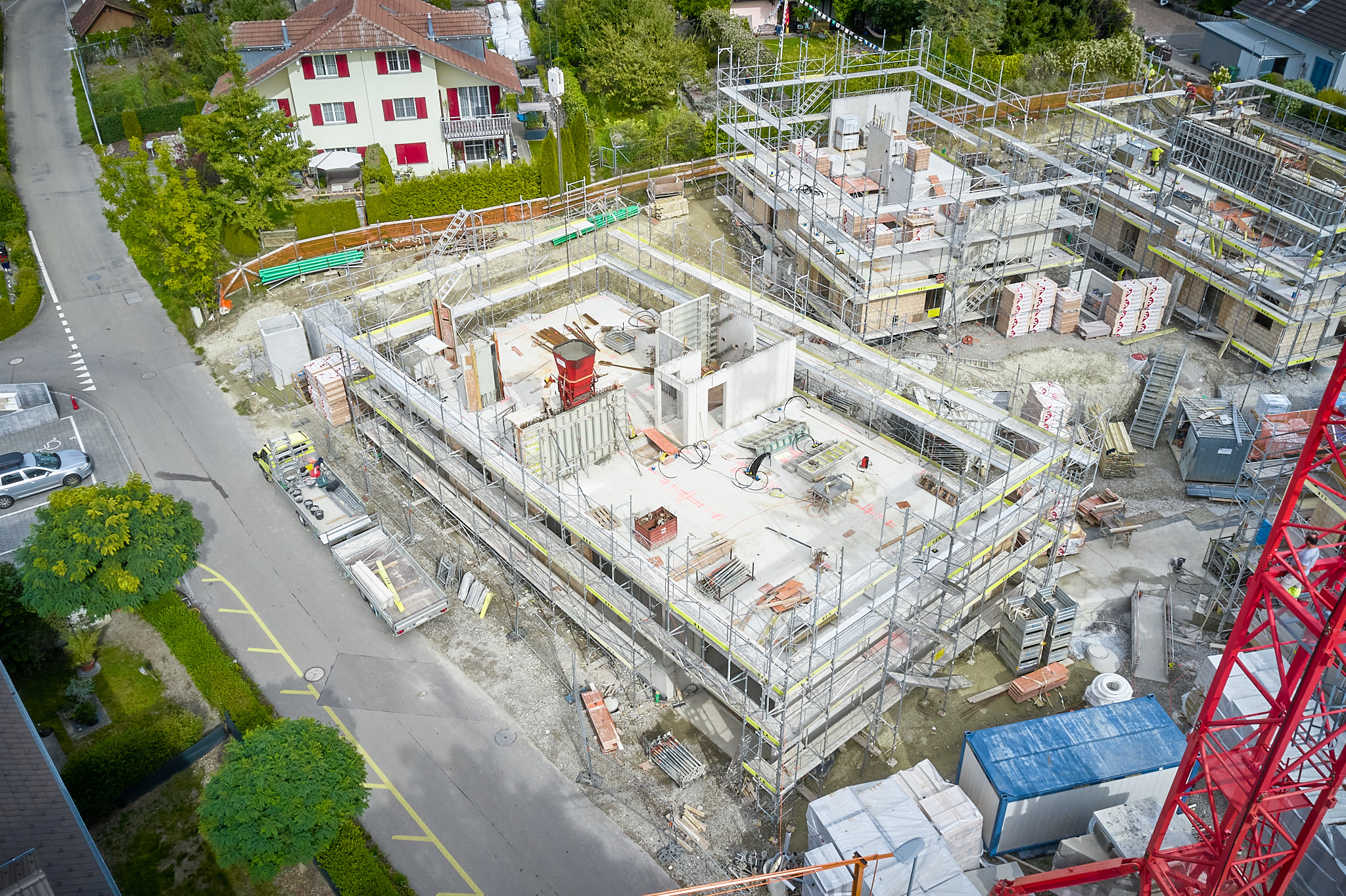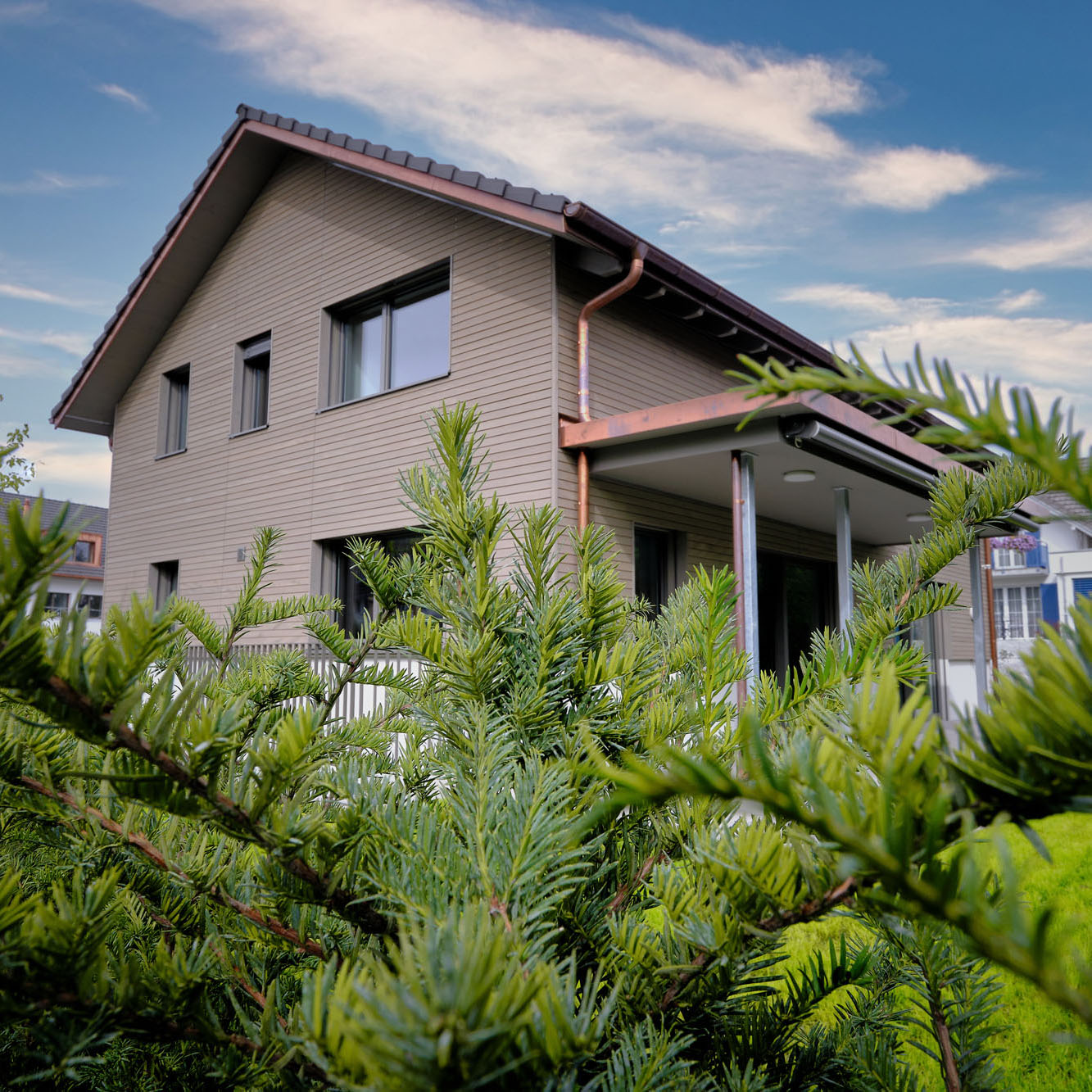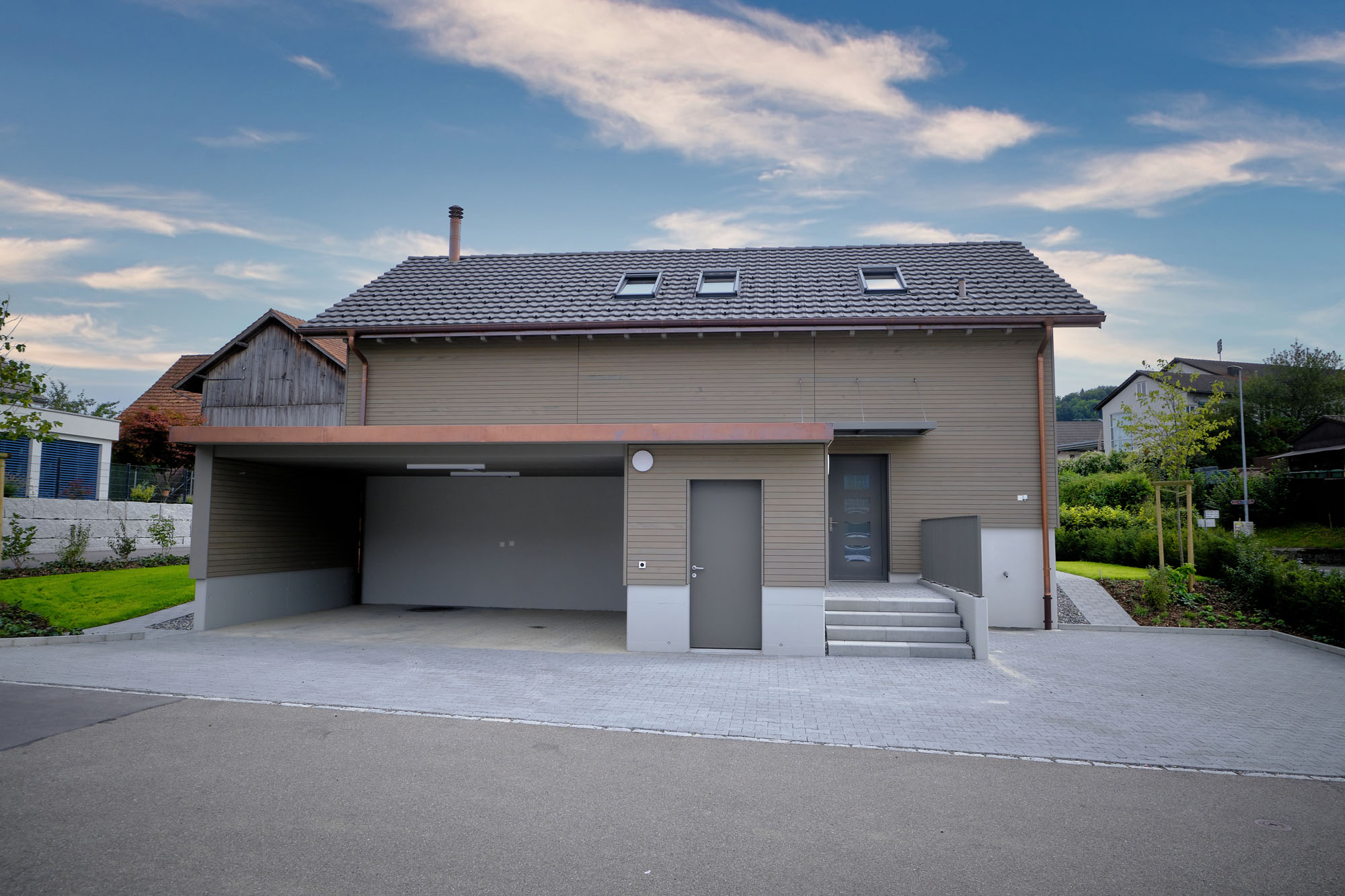 Die dreigeschossigen Mehrfamilienhäuser sowie die Doppel- und Reiheneinfamilienhäuser wurden mit hochwertigen Materialien und nach den neusten Minergie-Standards gebaut. Die Konstruktion der Dachgeschosse ist aus Holz, vorfabriziert in den eigenen Hallen von uns.