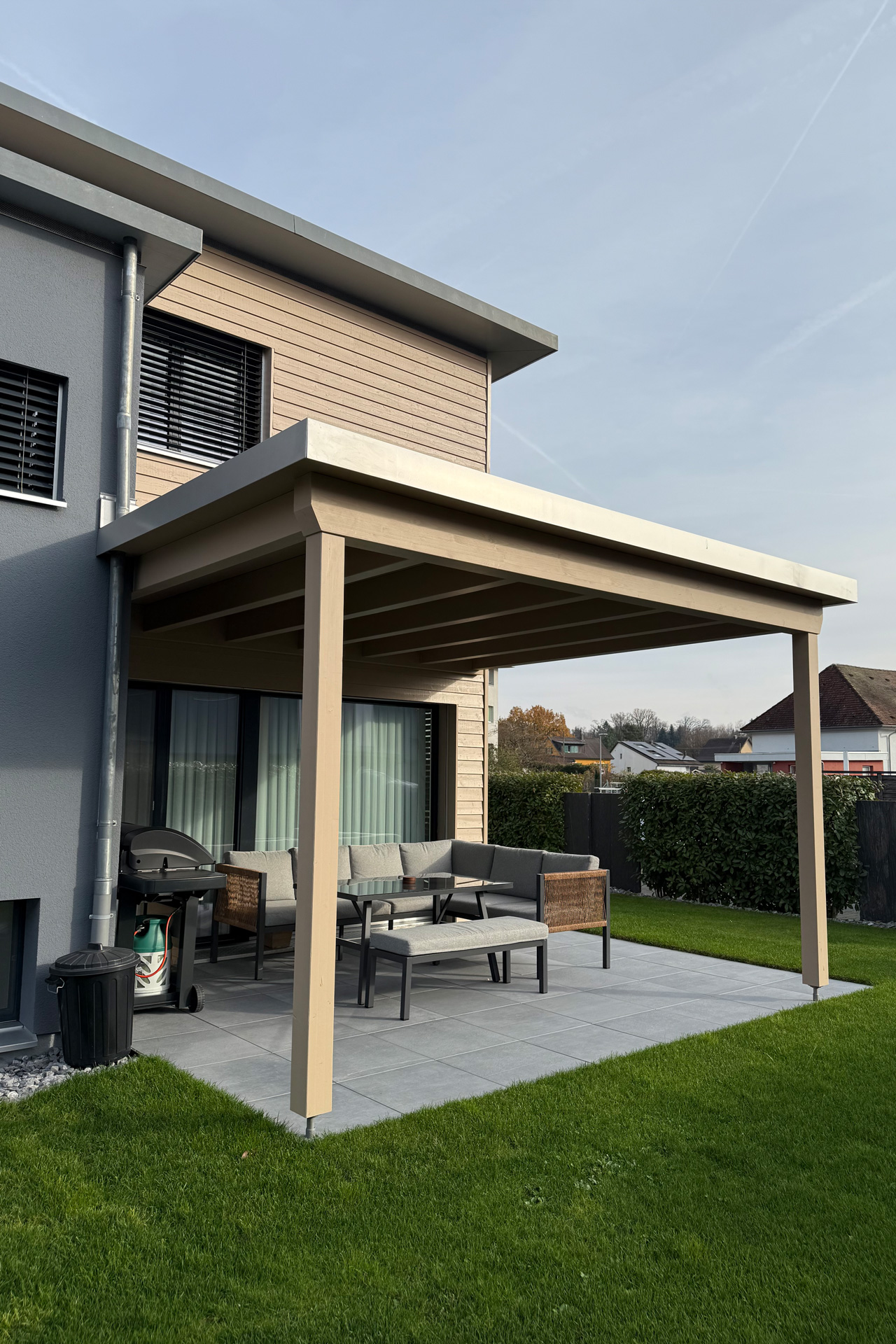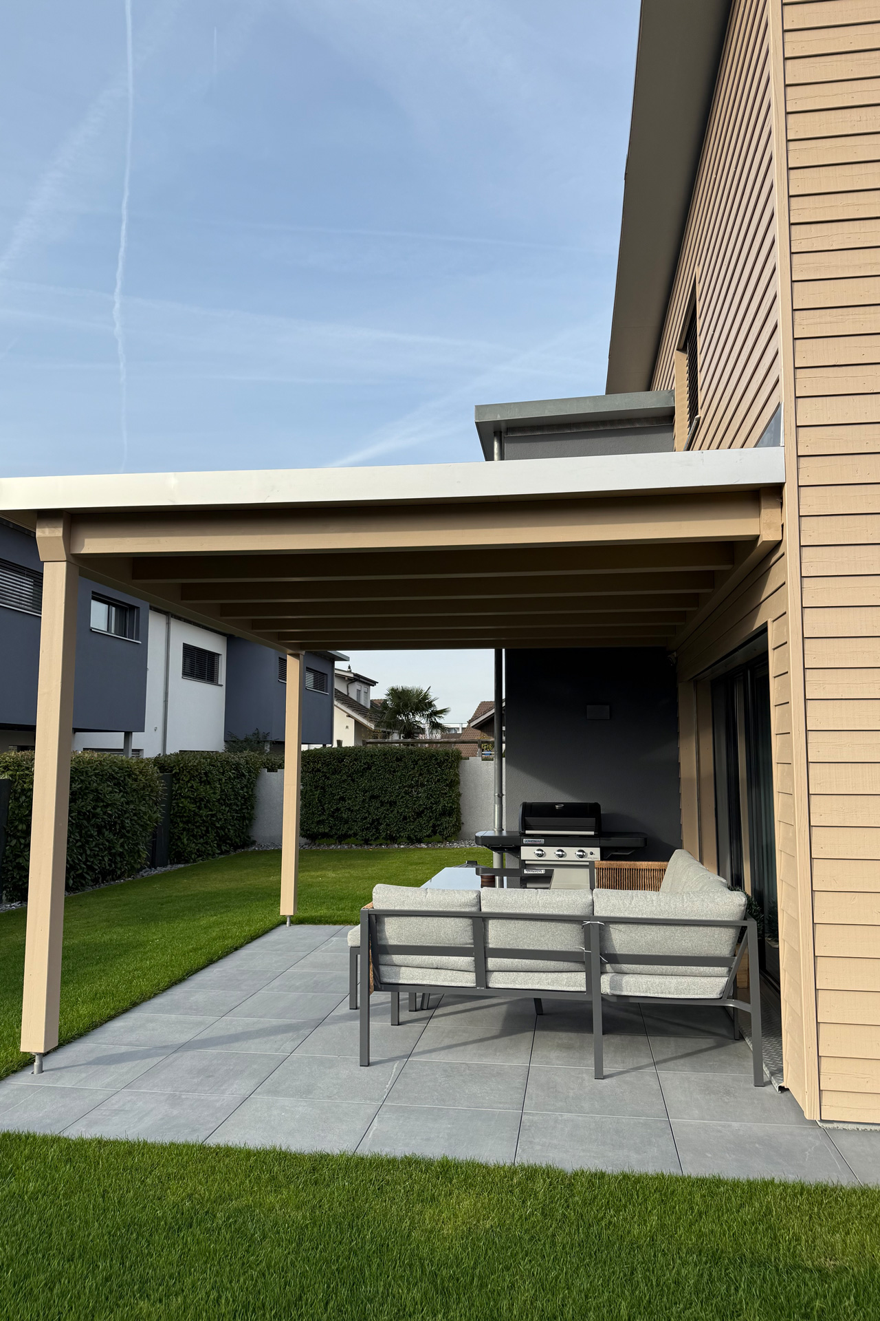 Um den Aussenbereich ganzjährig nutzbar zu machen, wurde an ein bestehendes Wohnhaus eine Sitzplatzüberdachung aus Holz angebaut. Die filigrane Konstruktion schafft einen geschützten Raum im Freien und verbindet auf stimmige Weise Architektur und Natur.