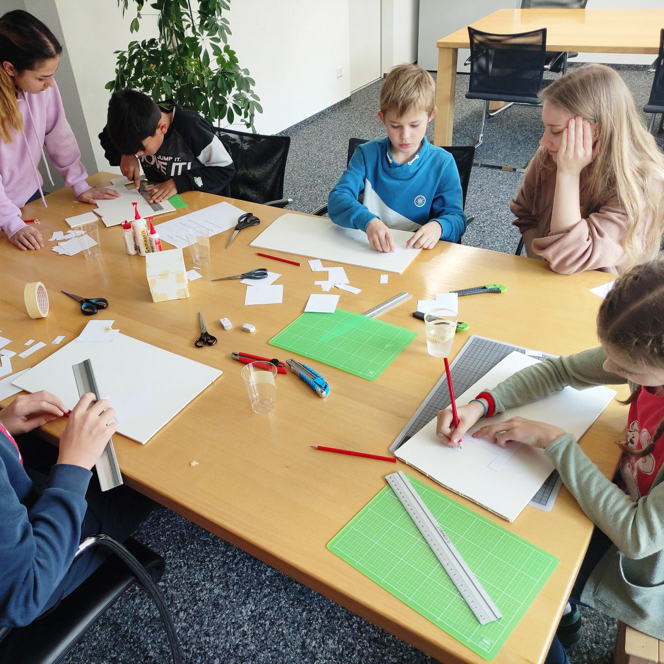 Am Nachmittag bauten die Kinder ein Modell. Es wurde geschnitten, geklebt, gezeichnet und nachgemessen. Natürlich in Begleitung von unseren beiden Auszubildenden in der Architektur, Michelle Hubschmid und Rozerin Mendil.